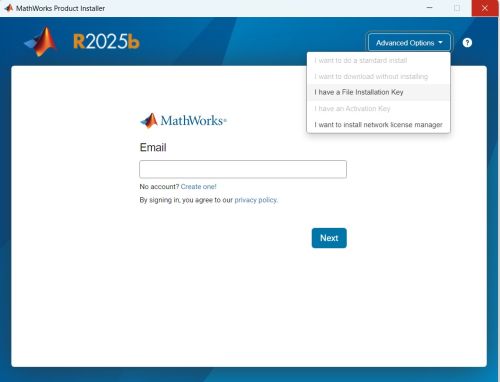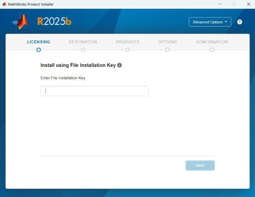 5.Der Matlab-Installer wird gestartet. Bitte wählen Sie unter „Advanced Options“ die Option „I have a File Installation Key“ aus.