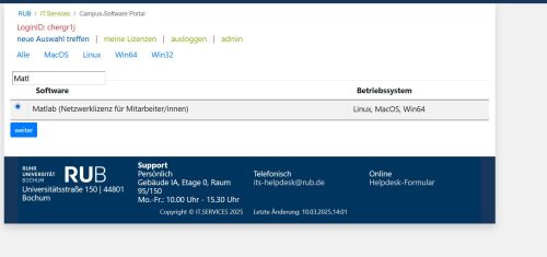 1. Loggen Sie sich im Campus-Software-Portal ein und wählen "Matlab Netzwerklizenz für Mitarbeiter" aus. Gehen Sie auf „Weiter“ und fordern die Lizenz an, indem Sie die nötigen Angaben bestätigen.