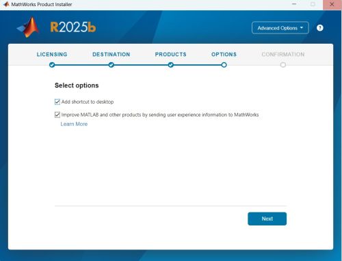 12. Klicken Sie auf das Auswahlkästchen „Add shortcut to desktop“, sofern Sie eine Verknüpfung von Matlab auf Ihrem Windows-Desktop haben möchten. Klicken Sie das Auswahlkästchen „Improve MATLAB by sending user experience information to MathWorks“ an, falls Sie tatsächlich Informationen bzgl. Ihrer Benutzererfahrungen an MathWorks senden möchten.