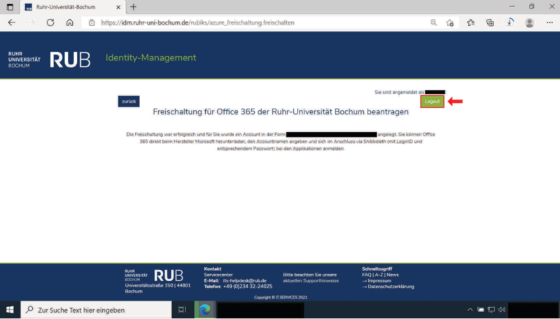 Die Lizenzierung war erfolgreich. Klicken Sie nun auf „Logout“ um sich abzumelden. HINWEIS: Bitte beachten Sie, dass Sie bis zur Nutzung von Office Pro Plus eine Stunde warten müssen.