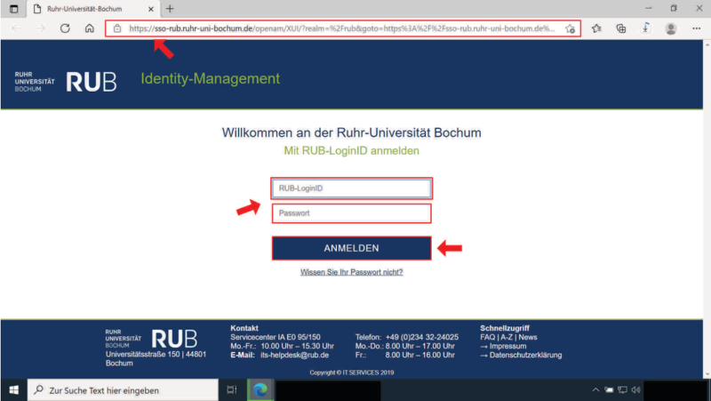 Geben Sie nun Ihre persönliche RUB-LoginID und das dazugehörigen Passwort ein und klicken Sie auf „Anmelden“.